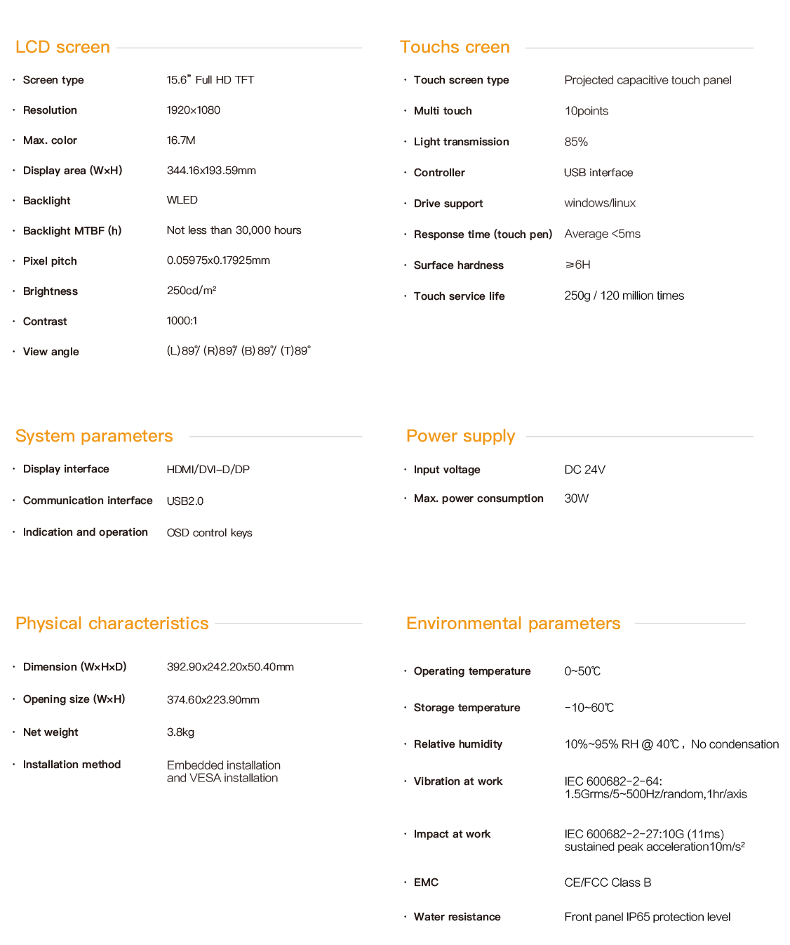 PD-8815 is an embedded ultra-thin industrial touch panel. It is equipped with a 15.6 "high-definition LCD screen with a resolution of 1920x1080 and a projected multi-point capacitive touch screen. It supports three signal transmission interfaces: HDMI, DVI and DP, as well as multiple USB2.0 interface expansions. The maximum communication distance between the PC and the touch panel can reach 30 meters, and the entire machine is powered by DC24V. The front panel has an IP65 protection rating. All interfaces are designed with fastening and have passed CE/FCC certification, making it suitable for demanding human-machine interaction industrial sites.