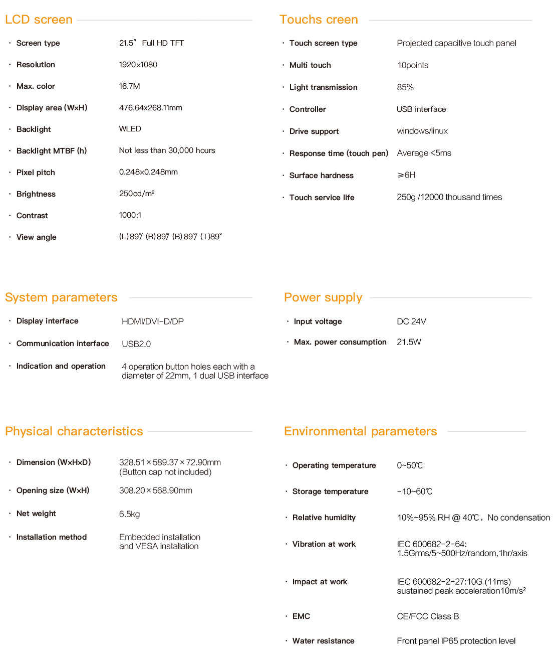 PD-8921 is an embedded ultra-thin vertical industrial touch panel with buttons. It is equipped with a 21.5 "high-definition LCD screen with a resolution of 1920x1080 and a projected multi-point capacitive touch screen. It supports three signal transmission interfaces: HDMI, DVI and DP, as well as multiple USB2.0 interface expansions. The maximum communication distance between the PC and the touch panel can reach 30 meters. The whole machine is powered by DC24V and the front panel has an IP65 protection level. All interfaces adopt a fastened design and have passed CE/FCC certification, making them suitable for demanding human-machine interaction industrial sites.