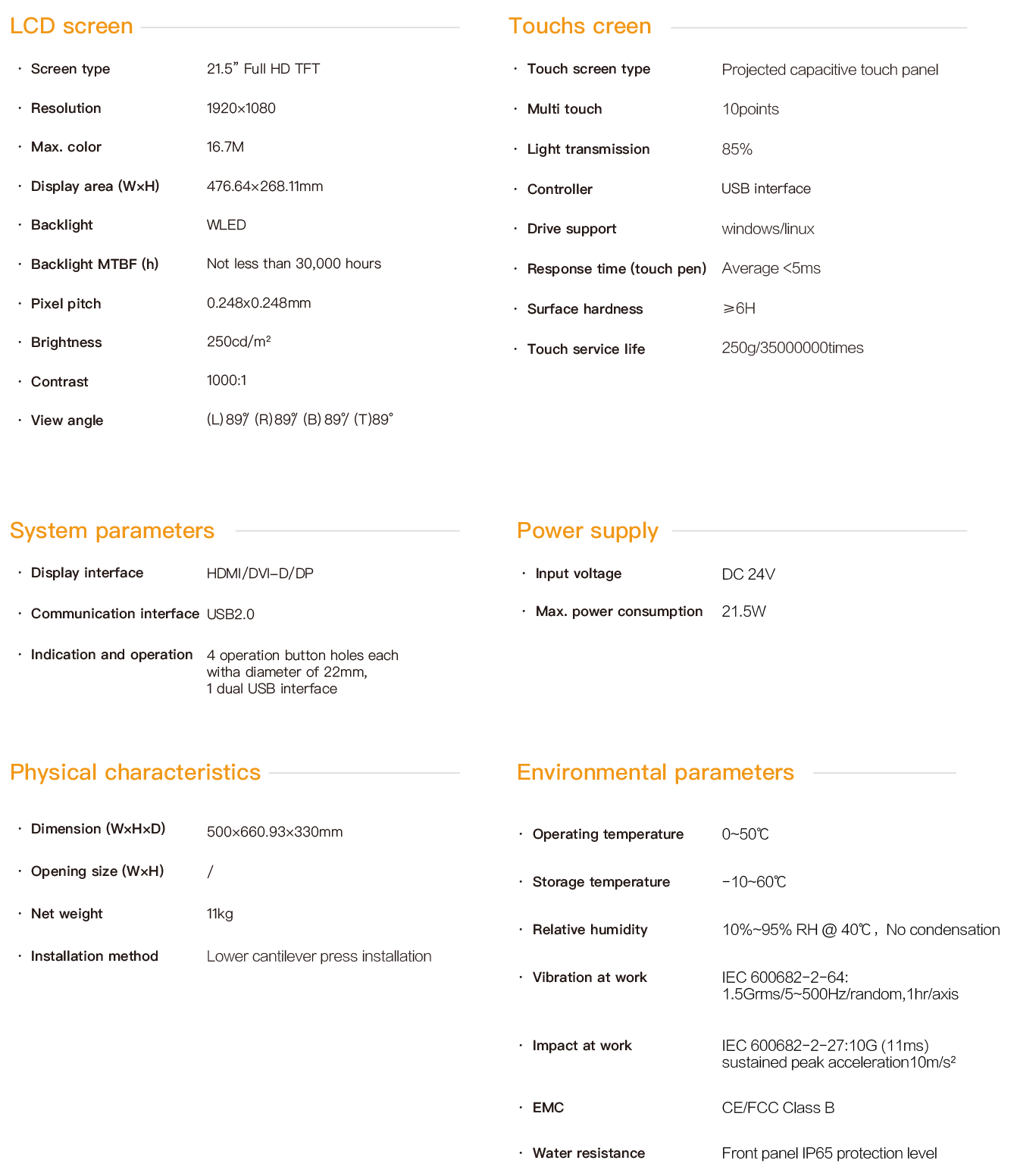 The PDX-3921 is a vertical industrial touch panel with a cantilever mounting at the bottom. It is equipped with operation buttons and a keyboard stand, featuring a 21.5 "high-definition LCD screen with a resolution of 1920x1080 and a projected multi-touch capacitive screen. It supports three signal transmission interfaces: HDMI, DVI and DP, as well as multiple USB2.0 interface expansions. The maximum communication distance between the PC and the touch panel can reach 30 meters, and the entire machine is powered by DC24V. The front panel has an IP65 protection rating. All interfaces are designed with fastening and have passed CE/FCC certification, making it suitable for demanding human-machine interaction industrial sites.