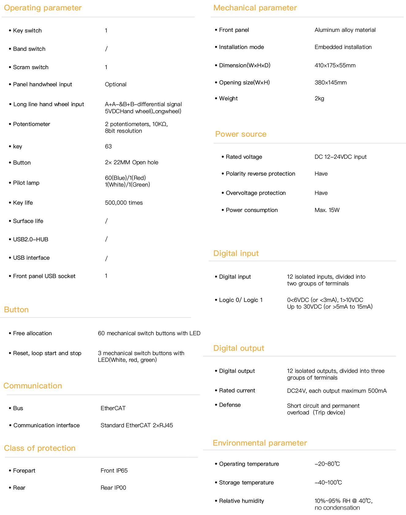 EC-8107 is an EtherCAT industrial bus operation panel. It is applicable to CNC numerical control systems and can achieve precise and reliable human-machine interaction. It is equipped with 63 operation keys, 63 status indicator lights, 2 pulse handwheel interfaces (1 differential and 1 single-ended), 2 256-range potentiometers, 21 range band selection switches for range setting, 1 three-range key switch, 12 isolated GPO and 12 isolated GPI, as well as an independent emergency stop switch. Default DC 24V input (dual main and backup channels). The whole machine adopts an anti-interference design, which can effectively resist the interference of high-power motors, servo systems, etc. in industrial sites, providing a good operating experience.