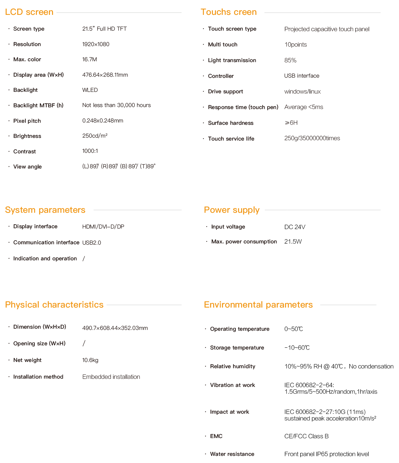 The PDS-6721 is an industrial touch panel with an upper cantilever installation. It features vertical screen display and is equipped with a keyboard stand. It is configured with a 21.5 "high-definition LCD screen with a resolution of 1920*1080 and a projected multi-touch capacitive screen. It supports three signal transmission interfaces: HDMI, DVI and DP, as well as multiple USB2.0 interface expansions. The maximum communication distance between the PC and the touch panel can reach 30 meters. The whole machine is powered by DC24V and the front panel has an IP65 protection level. All interfaces adopt a fastened design and have passed CE/FCC certification, making them suitable for demanding human-machine interaction industrial sites.