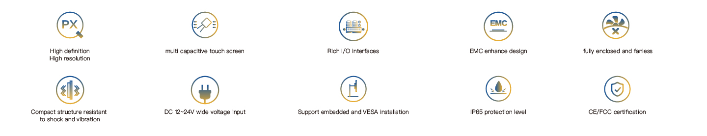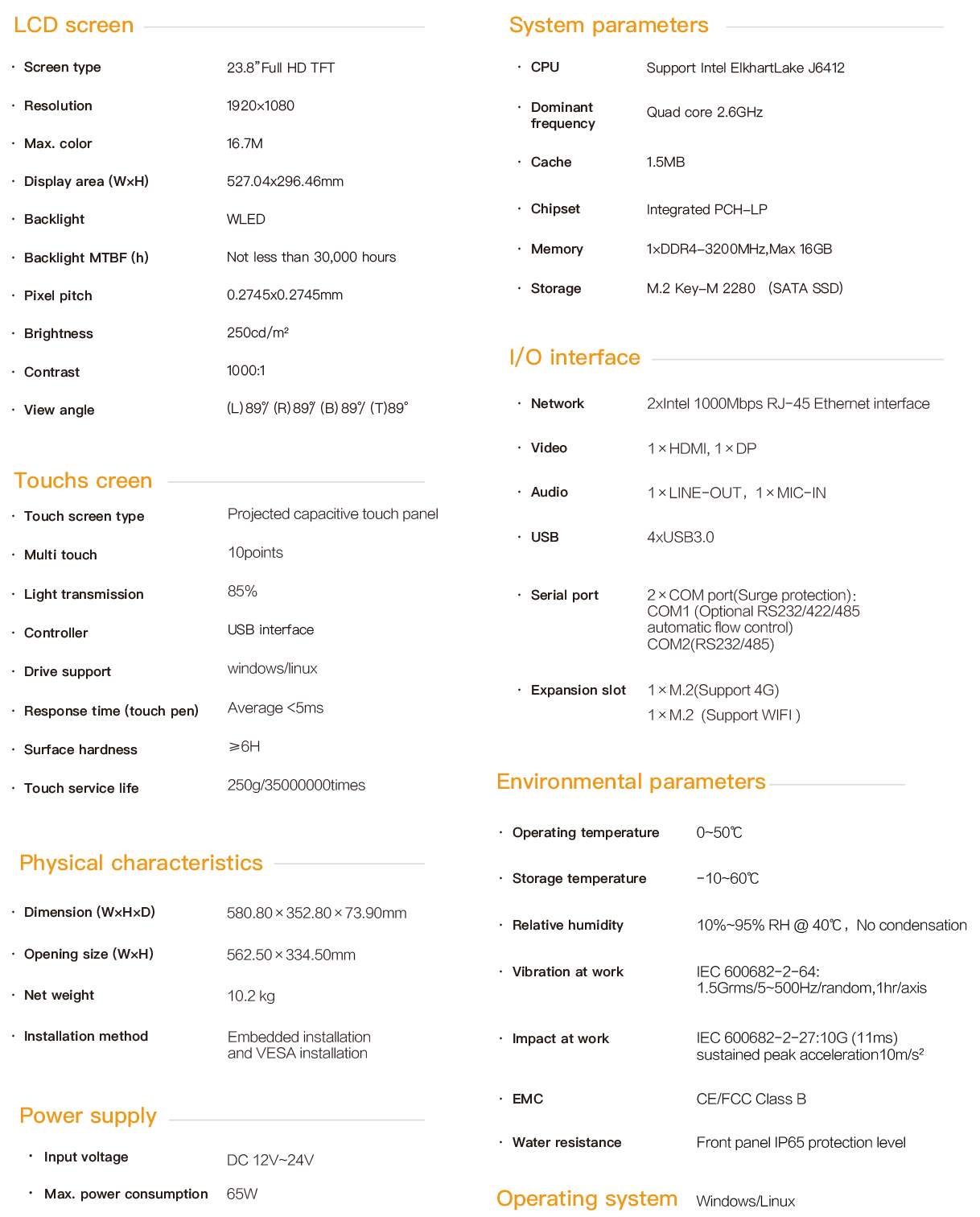 TPC-5623 is an embedded industrial capacitive touch tablet computer. It adopts a fanless and silent design, combining industrial display and touchscreen technology. The product is compact in structure, easy to install and convenient to operate. It is a high-performance and highly reliable industrial computer system. The whole machine adopts a 23.8-inch high-definition LCD screen with a resolution of 1920x1080, featuring rich and delicate colors and a wide viewing Angle. It is powered by a 12-24V wide-voltage DC and is equipped with a round-mouth DC power connector with locking screws to prevent accidental detachment. The touch control adopts a projected capacitive screen and supports 10-point touch simultaneously. The main unit is based on the IntelElkhartLake processing platform CPU, featuring the J6412 processor, equipped with a large-capacity solid-state SSD, DDR4 memory supporting 1×16G capacity, 4×USB3.0, and dual intel gigabit network cards. COM1 supports RS-232/422/485. It has one M.2 expansion slot inside for 4G expansion and another M.2 for WIFI expansion. One HDMI and one DP interface are used for multi-display mode. The TPC-5623 supports multiple installation methods: hook-mounted embedded installation, VESA-based wall-mounted and cantilevered installation. The front panel complies with the NEMA/IP65 water and dust resistance standard, preventing water splashes from entering during installation in the control cabinet. The high-strength all-steel sealed box structure has the functions of shock resistance and vibration protection. Especially, the specialized EMC design enables the entire machine to have excellent anti-interference ability and be able to adapt to the harsh working environment in industrial sites. It is widely applied in industrial scenarios with strong interference such as factory automation, mechanical manufacturing, numerical control equipment, textile equipment, communication networks and power automation.