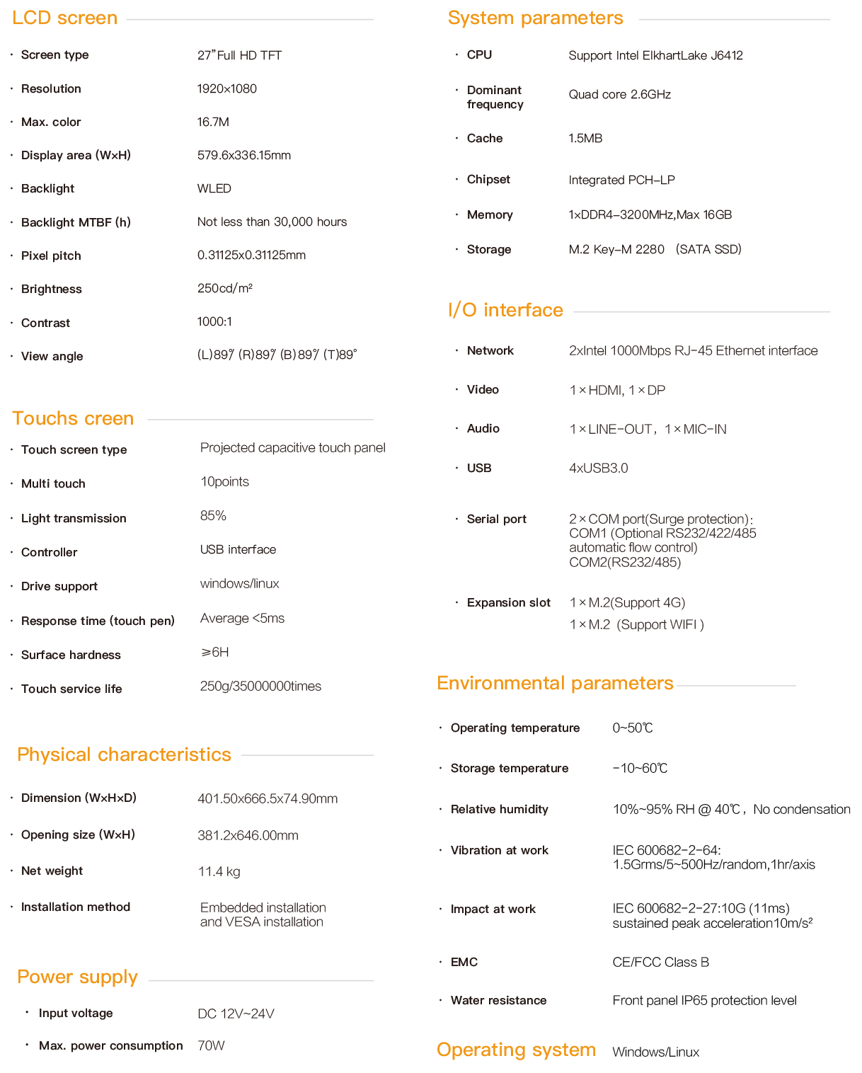 TPC-5627 is an embedded industrial capacitive touch tablet computer. It adopts a fanless and silent design, combining industrial display and touchscreen technology. The product is compact in structure, easy to install and convenient to operate. It is a high-performance and highly reliable industrial computer system. The whole machine adopts a 27-inch high-definition LCD screen with a resolution of 1920x1080, featuring rich and delicate colors and a wide viewing Angle. It is powered by a 12-24V wide-voltage DC and is equipped with a round-mouth DC power connector with locking screws to prevent accidental detachment. The touch control adopts a projected capacitive screen and supports 10-point touch simultaneously. The main unit is based on the IntelElkhartLake processing platform CPU, equipped with the J6412 processor and a large-capacity solid-state SSD. DDR4 memory supports 1x16G capacity, 4xUSB3.0, dual intel gigabit network cards, COM1 port supports RS232/422/485, COM2 port supports RS232/485. There is one M.2 expansion slot inside for 4G expansion, another M.2 for WIFI expansion, and one HDMI and one DP interface for multi-display mode.. The TPC-5627 supports multiple installation methods: hook-mounted embedded installation, VESA-based wall-mounted and cantilevered installation. The front panel complies with the NEMA/IP65 water and dust resistance standard, preventing water splashes from entering during installation in the control cabinet. The high-strength all-steel sealed box structure has the functions of shock resistance and vibration protection. Especially, the specialized EMC design enables the entire machine to have excellent anti-interference ability and be able to adapt to the harsh working environment in industrial sites. It is widely applied in industrial scenarios with strong interference such as factory automation, mechanical manufacturing, numerical control equipment, textile equipment, communication networks and power automation.