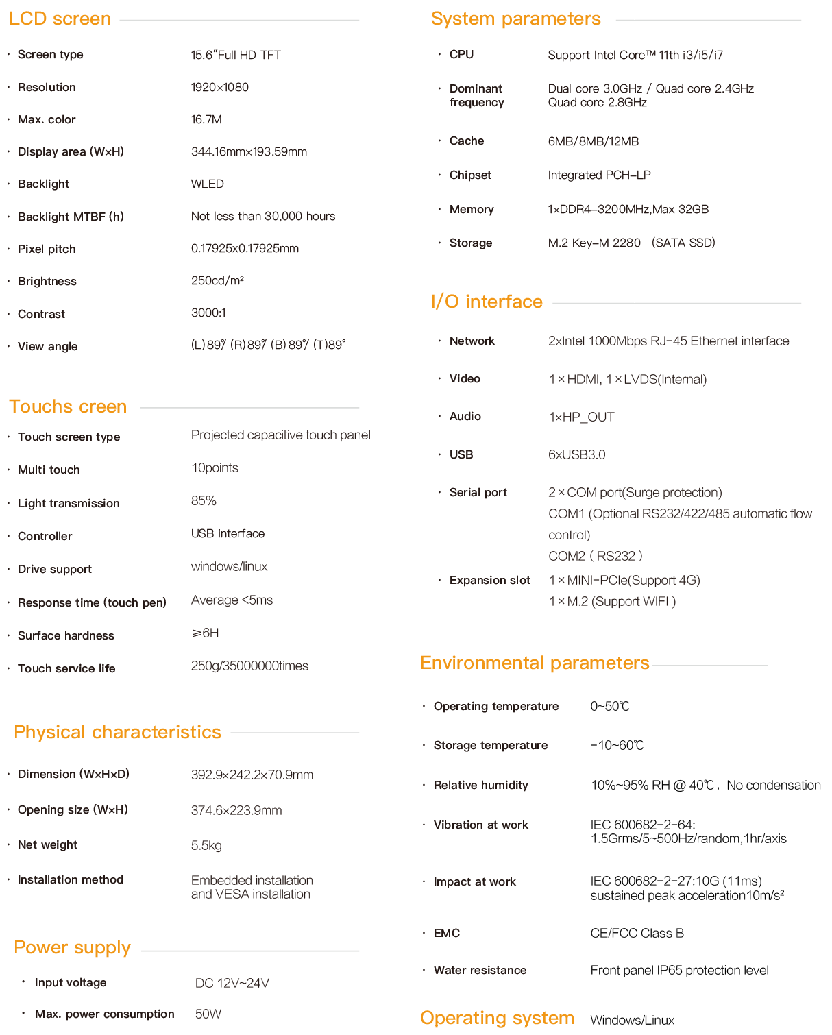The PPC-7615 is an embedded industrial capacitive touch tablet computer. It adopts a fanless and silent design, combining industrial display and touchscreen technology. The product is compact in structure, easy to install and convenient to operate. It is a high-performance and highly reliable industrial computer system. The whole machine adopts a 15.6-inch high-definition LCD screen with a resolution of 1920x1080, featuring rich and delicate colors and a wide viewing Angle. It is powered by a 12-24V wide-voltage DC and is equipped with a round-mouth DC power connector with locking screws to prevent accidental detachment. The touch control adopts a projected capacitive screen and supports 10-point touch simultaneously. The main unit is equipped with an Intel 11th generation CPU and a large-capacity solid-state SSD. DDR4 memory supports 1×32G capacity, 6×USB3.0, dual intel gigabit network cards. COM1 supports RS232/422/485, and COM2 port supports R232. The internal MINI-PCIe and M.2 expansion slots facilitate I/O expansion for 4G, WIFI, etc. The PPC-7615 supports multiple installation methods: hook-mounted embedded installation, VESA-based wall-mounted and cantilevered installation. The front panel complies with the NEMA/IP65 water and dust resistance standard, preventing water splashes from entering during installation in the control cabinet. The high-strength all-steel sealed box structure has the functions of shock resistance and vibration protection. Especially, the specialized EMC design enables the entire machine to have excellent anti-interference ability. It can adapt to the harsh working environment of industrial sites and is widely used in factory automation, mechanical manufacturing, numerical control equipment, textile equipment, communication networks and power automation and other industrial occasions with strong interference.