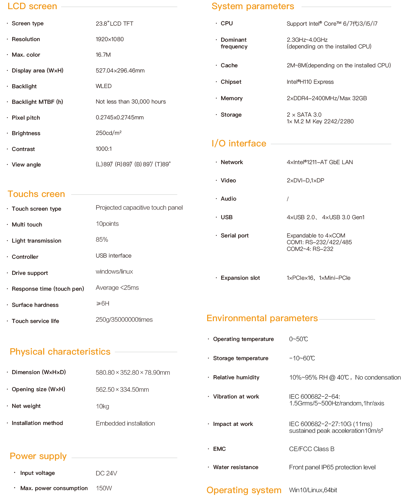 The HPC-9623 is an industrial capacitive touch tablet computer that combines industrial display and touch screen technology. The product has a compact structure, is easy to install and operate, and is a high-performance and highly reliable industrial computer system. The whole machine adopts a 23.8-inch high-definition LCD screen with a resolution of 1920*1080, featuring rich and delicate colors and a wide viewing Angle. It is powered by 24V DC and adopts a projected 10-point capacitive screen. The mainframe part is equipped with Intel Core 6th / 7th generation cpus. Configurable large-capacity solid-state SSD, with memory support up to 32G capacity. The HPC-9623 supports hook-type embedded installation. The front panel complies with the IP65 water and dust resistance standard, preventing water splashes from entering during installation in the control cabinet. The high-strength all-steel box structure features shock resistance and vibration protection functions. Especially, the specialized EMC design enables the entire machine to have excellent anti-interference ability and be able to adapt to the harsh working environment in industrial sites. It is widely applied in industrial sites with strong interference such as factory automation, mechanical manufacturing, numerical control equipment, textile equipment, communication networks and power automation.