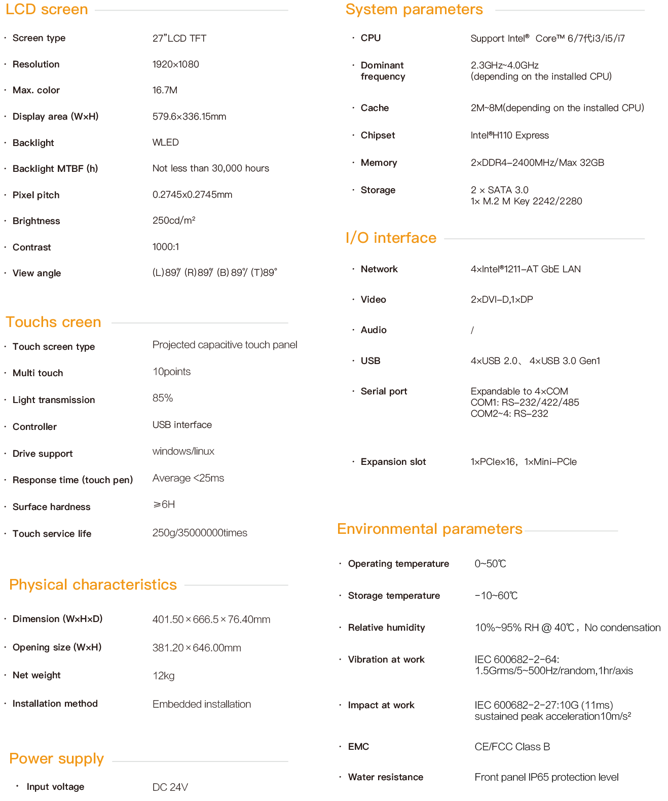 The HPC-9627 is an industrial capacitive touch tablet computer that combines industrial display and touch screen technology. The product has a compact structure, is easy to install and operate, and is a high-performance and highly reliable industrial computer system. The whole machine adopts a 27-inch high-definition LCD screen with a resolution of 1920*1080, featuring rich and delicate colors and a wide viewing Angle. It is powered by 24V DC and adopts a projected 10-point capacitive screen. The main unit is equipped with Intel Core 6th / 7th generation cpus, and can be configured with large-capacity solid-state SSDS. The memory supports a maximum capacity of 32G. The HPC-9627 supports hook-type embedded installation. The front panel complies with the IP65 water and dust resistance standard, preventing water splashes from entering during installation in the control cabinet. The high-strength all-steel box structure features shock resistance and vibration protection functions. Especially, the specialized EMC design enables the entire machine to have excellent anti-interference ability and be able to adapt to the harsh working environment in industrial sites. It is widely applied in industrial sites with strong interference such as factory automation, mechanical manufacturing, numerical control equipment, textile equipment, communication networks and power automation.
