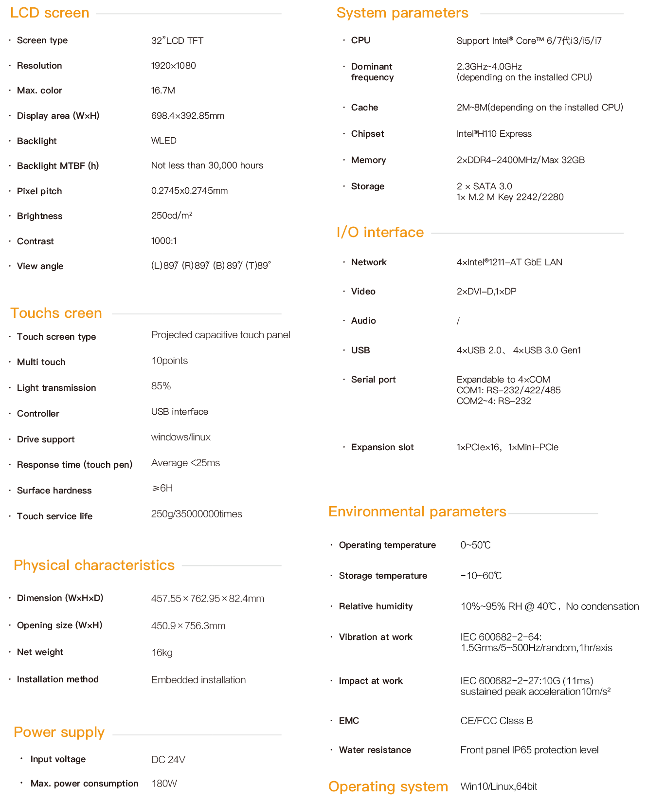 The HPC-9632 is an industrial capacitive touch tablet computer that combines industrial display and touch screen technology. The product has a compact structure, is easy to install and operate, and is a high-performance and highly reliable industrial computer system. The whole machine adopts a 32-inch high-definition LCD screen with a resolution of 1920*1080, featuring rich and delicate colors and a wide viewing Angle. It is powered by 24V DC and adopts a projected 10-point capacitive screen. The mainframe part is equipped with Intel Core 6th / 7th generation cpus. Configurable large-capacity solid-state SSD, with memory support up to 32G capacity. The HPC-9632 supports hook-type embedded installation. The front panel complies with the IP65 water and dust resistance standard, preventing water splashes from entering during installation in the control cabinet. The high-strength all-steel box structure features shock resistance and vibration protection functions. Especially, the specialized EMC design enables the entire machine to have excellent anti-interference ability and be able to adapt to the harsh working environment in industrial sites. It is widely applied in industrial sites with strong interference such as factory automation, mechanical manufacturing, numerical control equipment, textile equipment, communication networks and power automation.