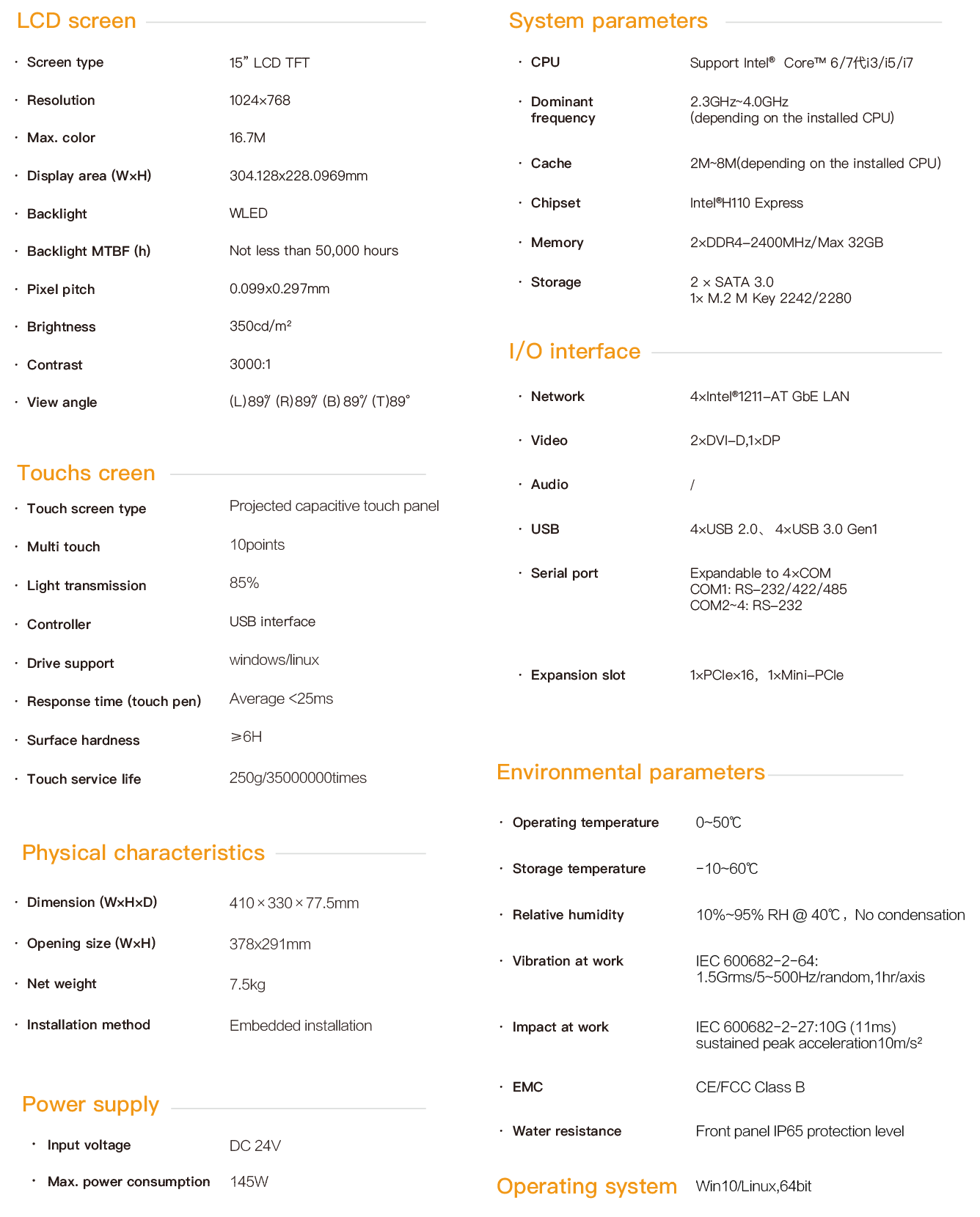 NPC-154i is an industrial capacitive touch tablet computer that combines industrial display and touch screen technology. The product has a compact structure, is easy to install and operate, and is a high-performance and highly reliable industrial computer system. The whole machine adopts a 15-inch high-definition LCD screen with a resolution of 1024*768, featuring rich and delicate colors and a wide viewing Angle. It is powered by 24V DC and adopts a projected 10-point capacitive screen. The mainframe part is equipped with Intel Core 6th / 7th generation cpus. Configurable large-capacity solid-state SSD, with memory support up to 32G capacity. NPC-154i supports hook-type embedded installation. The front panel complies with the IP65 water and dust resistance standard, preventing water splashes from entering during installation in the control cabinet. The high-strength all-steel box structure features shock resistance and vibration protection functions. Especially, the specialized EMC design enables the entire machine to have excellent anti-interference ability and be able to adapt to the harsh working environment in industrial sites. It is widely applied in industrial sites with strong interference such as factory automation, mechanical manufacturing, numerical control equipment, textile equipment, communication networks and power automation.