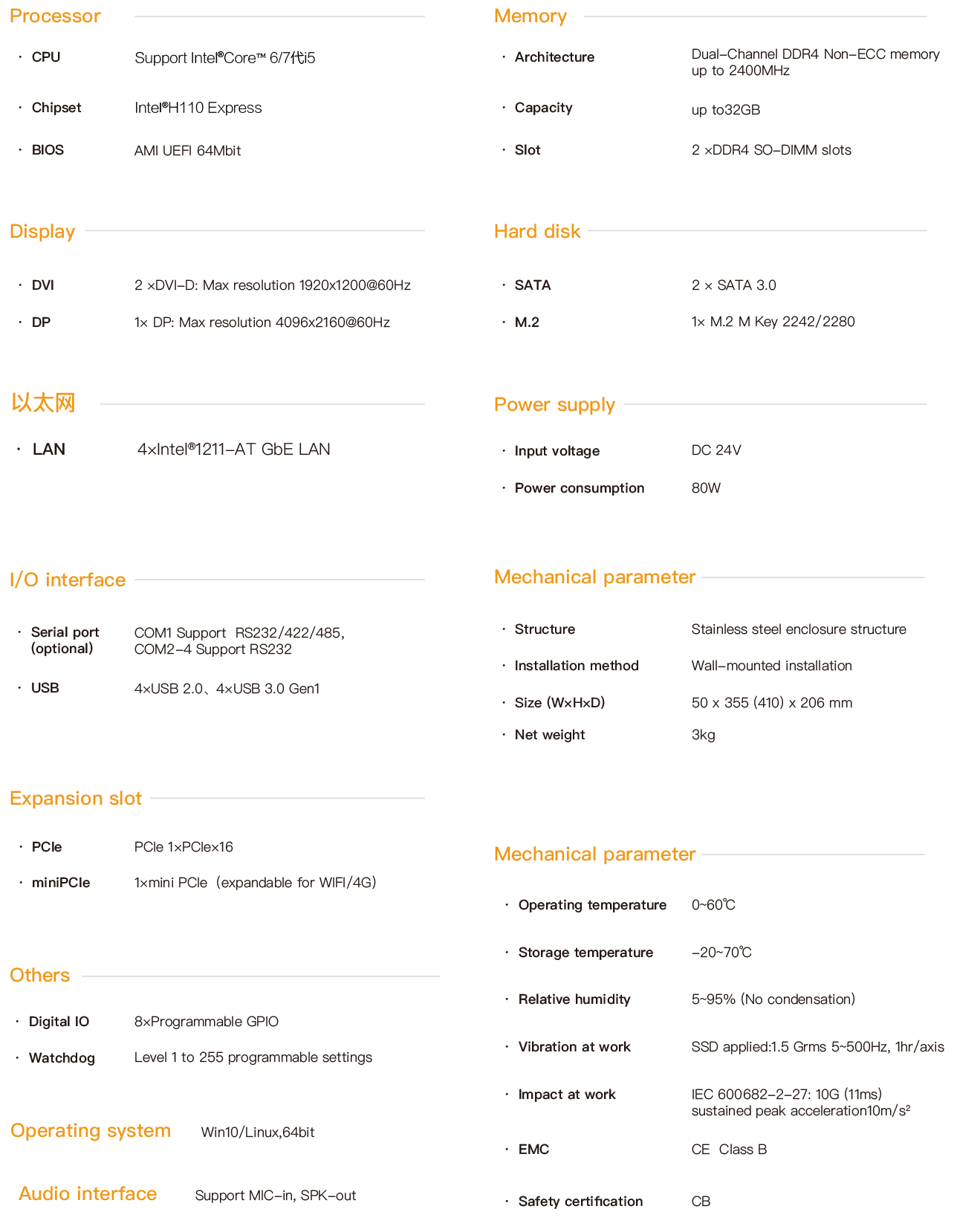 EPC-9954L is an industrial computer based on the high-performance Intel Core 6th / 7th generation processors. Configurable large-capacity solid-state SSD, with a maximum memory capacity of 32G, and supports DVI/DP display interfaces. It has 4 Intel GbE gigabit network ports, 4 USB3.0 interfaces, 4 USB2.0 interfaces. COM1 supports RS232/RS422/RS485, and COM2 supports RS232. The whole machine is powered by 24V DC. All interfaces are designed with fastening and have passed CE/FCC certification. It can be applied to harsh industrial sites. The operating system supports Windows10 and Linux.