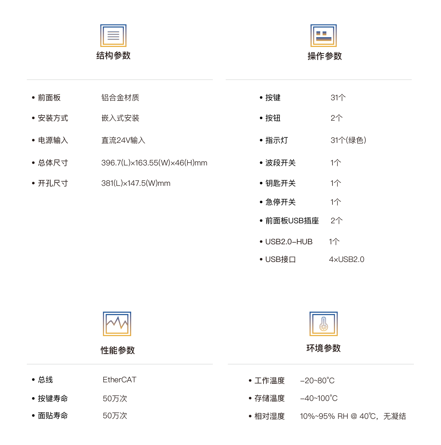 EC-8101是一款高性能基于EtherCAT工業(yè)以太網(wǎng)總線的操作面板,實(shí)現(xiàn)高速而且可靠的人機(jī)互動(dòng),作為一款專用HMI操作面板,配備了31個(gè)操作按鍵,31個(gè)狀態(tài)指示燈,1個(gè)21檔速度進(jìn)給波段開關(guān),2個(gè)USB直通母座,1個(gè)4口USB2.0-HUB,獨(dú)立鑰匙開關(guān),啟動(dòng)按鈕,停止按鈕和急停開關(guān),整機(jī)采用抗干擾設(shè)計(jì)適應(yīng)各種電磁環(huán)境復(fù)雜的工業(yè)現(xiàn)場(chǎng)。通過掛鉤實(shí)現(xiàn)嵌入式安裝,便于安裝與維護(hù)。