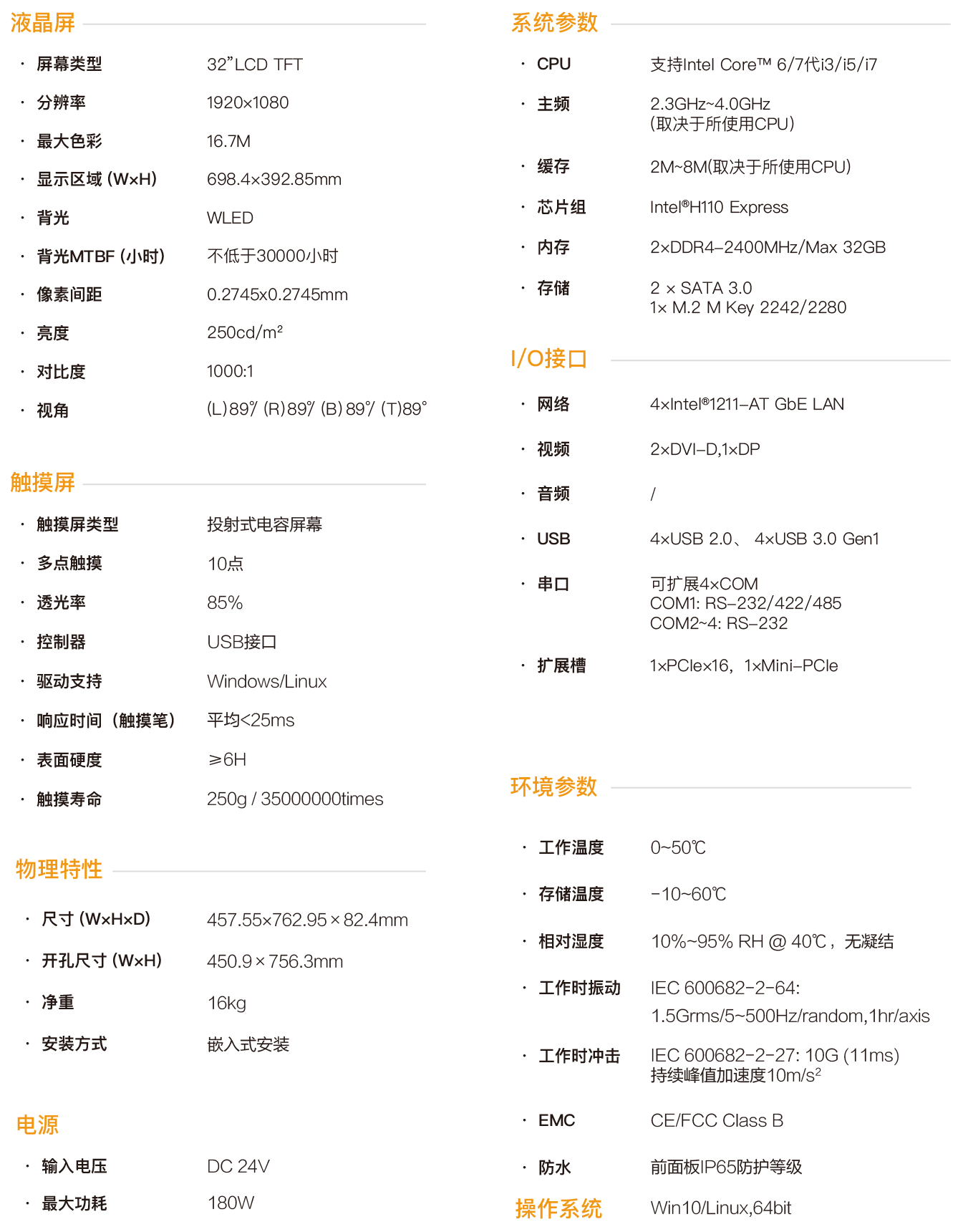 HPC-9632是一款工業(yè)型電容觸控平板電腦,將工業(yè)顯示和觸摸屏技術(shù)相結(jié)合,產(chǎn)品結(jié)構(gòu)緊湊、易于安裝、操控方便,是一款高效能、高可靠的工業(yè)電腦系統(tǒng),整機(jī)采用32寸分辨率為1920*1080的高清液晶顯示屏,色彩豐富細(xì)膩,視角寬闊,24V直流供電,采用投射式10點(diǎn)電容屏,主機(jī)部分搭載Intel Core 6/7代CPU,可配置大容量固態(tài)SSD,內(nèi)存支持最大32G容量。 HPC-9632支持掛鉤式嵌入式安裝,前面板符合IP65防水防塵標(biāo)準(zhǔn),杜絕安裝在控制柜時(shí)因現(xiàn)場(chǎng)飛濺的水滴進(jìn)入,高強(qiáng)度全鋼型箱體結(jié)構(gòu),具有抗沖擊和振動(dòng)防護(hù)功能,尤其是專門(mén)的EMC設(shè)計(jì)使得整機(jī)具有優(yōu)秀的抗干擾能力,能夠適應(yīng)工業(yè)現(xiàn)場(chǎng)惡劣的工作環(huán)境,廣泛應(yīng)用于工廠自動(dòng)化、機(jī)械制造、數(shù)控設(shè)備、紡織設(shè)備、通訊網(wǎng)絡(luò)以及電力自動(dòng)化等強(qiáng)干擾的工業(yè)現(xiàn)場(chǎng)。