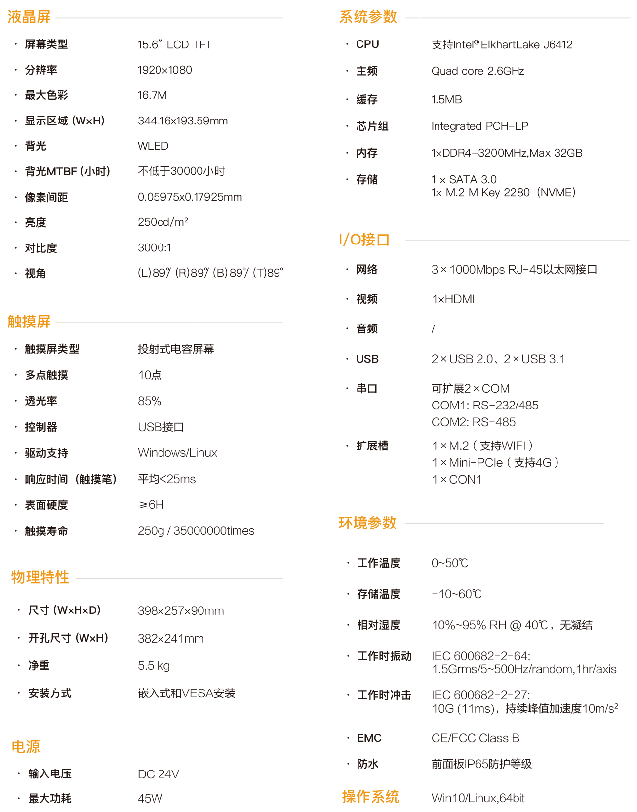 SPC-4715L是一款嵌入式工業(yè)型電容觸控平板電腦,采用 無風(fēng)扇靜音設(shè)計,將工業(yè)顯示和觸摸屏技術(shù)相結(jié)合,產(chǎn)品構(gòu)成緊 湊、易于安裝、操控方便,是一款高效能、高可靠的工業(yè)電腦系 統(tǒng), 整機采用15.6寸分辨率為1920x1080的高清液晶顯示屏,色 彩豐富細(xì)膩,視角寬闊,12~24V寬壓直流供電,觸控采用投射 式電容屏,同時支持10點觸摸,主機部基于Intel ElkhartLake處 理平臺CPU,采用J6412處理器,配置大容量固態(tài)SSD,DDR4 內(nèi)存支持1×32G容量,4×USB接口,3個intel千兆網(wǎng)卡,可擴展2 個COM口,COM1口支持RS232/422/485,COM2口支持 RS232/485,內(nèi)部1個Mini-PCIe擴展插槽可支持4G擴展,1個 M.2用于WIFI擴展,1個HDMI接口用于多顯示器模式。 SPC-4715L支持多種安裝方式:掛鉤式嵌入式安裝,基于 VESA的壁掛式和懸臂式安裝,前面板符合 NEMA/IP65 防水防 塵標(biāo)準(zhǔn),杜絕安裝在控制柜時因現(xiàn)場飛濺的水滴進入,高強度全 鋼型密封箱體結(jié)構(gòu),具有抗沖擊和振動防護功能,尤其是專門的 EMC設(shè)計使得整機具有優(yōu)秀的抗干擾能力,能夠適應(yīng)工業(yè)現(xiàn)場 惡劣的工作環(huán)境,廣泛應(yīng)用于工廠自動化、機械制造、數(shù)控設(shè)備、 紡織設(shè)備、通訊網(wǎng)絡(luò)以及電力自動化等強干擾工業(yè)場合。